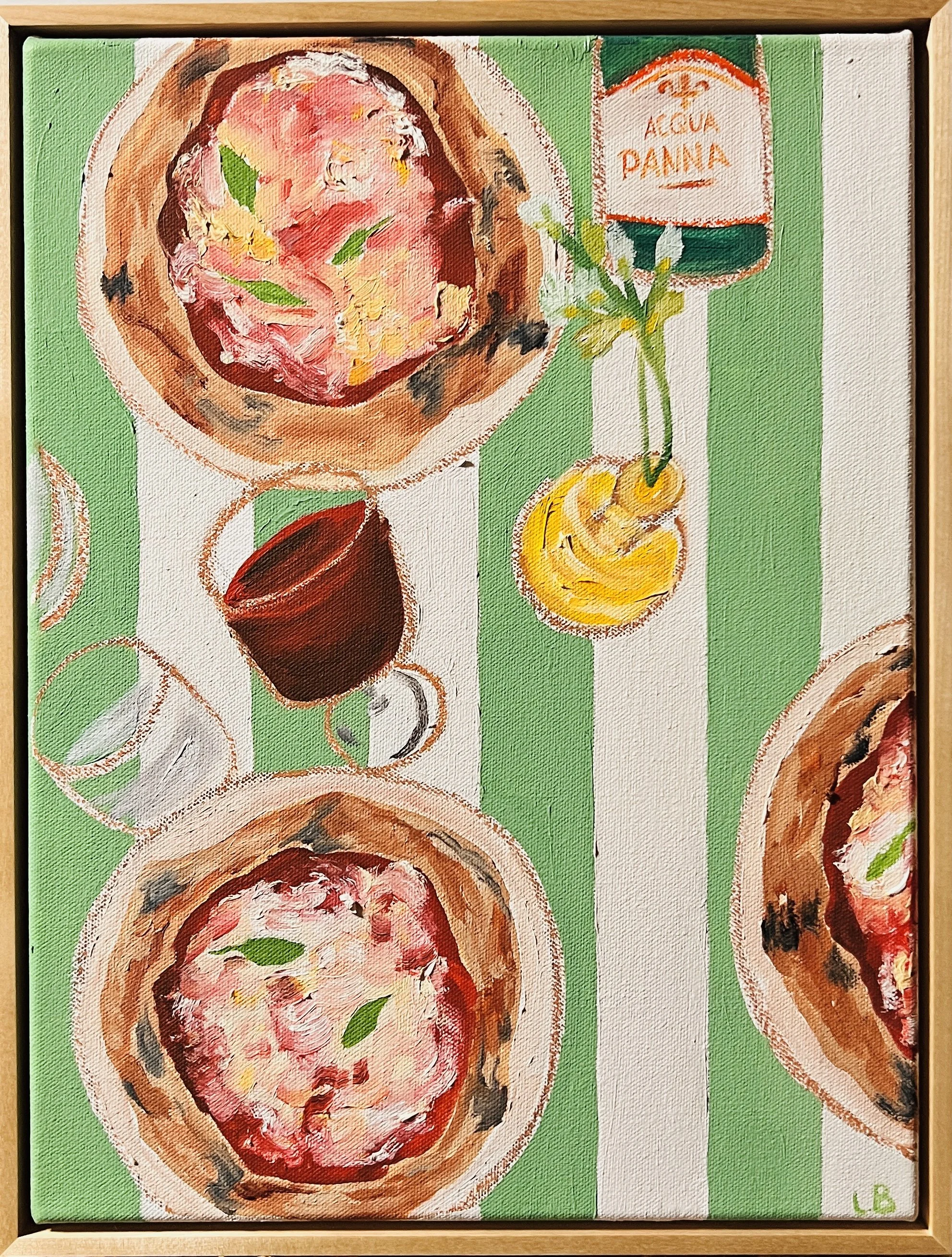 My youngest son and I have an obsession with Margherita pizza. Whenever we had the chance him and I would always order a Margherita pizza, not once did we order any other type of pizza. This painting is an ode to our favorite pizza and my love for Italian wine.